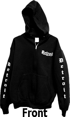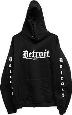 This classic zip up hoodie has the Detroit Motorcycle Company logo on the back and on the left front breast. It also has Detroit running down both sleeves with two pockets in the front to keep your things close and your hands warm. This hoodie is great for any weather year round. Made of 50% Cotton/50% Polyester. Machine washable.