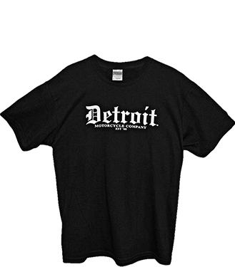 Comfortable men's 100% pre-shrunk cotton t-shirt with Detroit Motorcycle Company logo across the front. Machine washable.